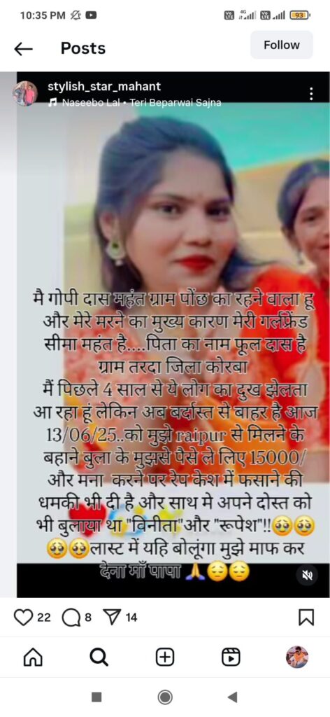 जांजगीर चांपा से इस वक्त की बड़ी खबर सामने आई है यहां पर एक 23 वर्षीय युवक ने फांसी लगाकर आत्महत्या कर ली है, जान देने से पहले मृतक ने इंस्टाग्राम पर एक सुसाइड नोट अपलोड किया है जिसमें उसने अपनी मौत का कारण अपनी गर्लफ्रेंड को ठहराया है.