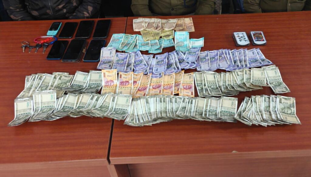मुखबिर से मिली सूचना पर पुलिस टीम ने घेराबंदी करते हुए कार्रवाई की। पुलिस के पहुंचते ही कुछ आरोपी भाग निकले, लेकिन सात लोगों को मौके से ही ताश के 52 पत्ती से ‘काट पत्ती’ नामक जुआ खेलते पकड़ा गया। गिरफ्तार आरोपियों के पास से कुल 74,120 रुपए नगद, 7 मोबाइल फोन लगभग 1 लाख रुपए कीमत के, तथा 8 मोटरसाइकिलें करीब 4 लाख रुपए मूल्य की बरामद की गईं। इसके अलावा 52 पत्ती ताश की दो गड्डी, लाल-काला दरी और दो मोमबत्तियाँ भी जप्त की गईं। कुल मिलाकर पुलिस ने 5,24,120 रुपए का माल जब्त किया है।