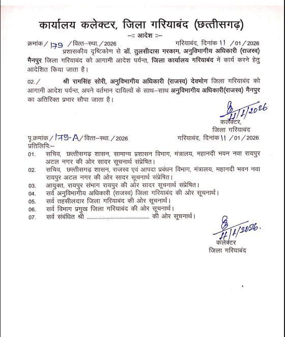 : कलेक्टर बी.एस. उईके द्वारा अनुविभागीय अधिकारी (राजस्व) मैनपुर तुलसीदास मरकाम के विरुद्ध शासकीय कर्तव्यों के निर्वहन में गंभीर उदासीनता एवं प्रशासनिक अनुशासन के उल्लंघन के संबंध में कारण बताओ सूचना पत्र जारी किया गया है। तहसील देवभोग अंतर्गत ग्राम उरमाल स्थित शासकीय भूमि पर बिना विधिसम्मत अनुमति के नृत्य, नाटक एवं संगीत से संबंधित कार्यक्रमों का सतत आयोजन किया गया। उक्त अवधि में संबंधित अनुविभागीय अधिकारी द्वारा न तो प्रभावी पर्यवेक्षण किया गया और न ही विधिसम्मत नियंत्रणात्मक कार्रवाई सुनिश्चित की गई, जबकि वे कार्यपालिक दंडाधिकारी के दायित्वों से भी आबद्ध हैं। –