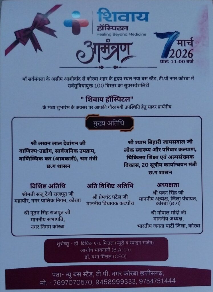 अत्याधुनिक उपकरणों और प्रशिक्षित विशेषज्ञ टीम के साथ हम हर मरीज को गुणवत्तापूर्ण उपचार देने के लिए प्रतिबद्ध हैं, ताकि गंभीर परिस्थितियों में भी मरीजों को बड़े शहरों की ओर रुख न करना पड़े।”कोरबा को मिला 100 बेड का सुपरस्पेशियलिटी तोहफा: 7 मार्च को ‘शिवाय हॉस्पिटल’ का भव्य शुभारंभ